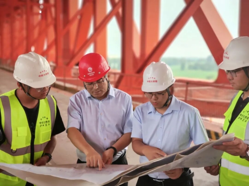 ▲張海鳳(左二)現場指導濟濱高鐵濟陽黃河公鐵兩用特大橋主橋鋼桁梁施工