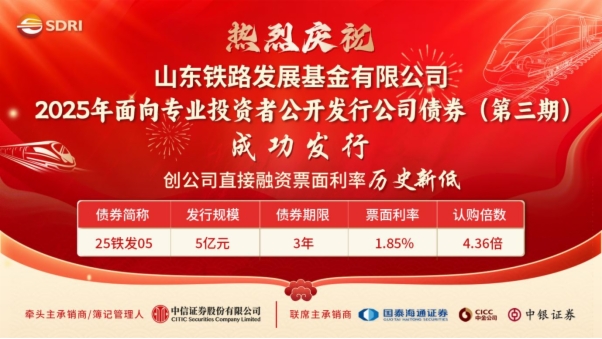 近日,山東鐵投集團權屬山東鐵路發展基金有限公司(以下簡稱基金公司)成功發行5億元公司債券,3年期票面利率低至1.85%,認購倍數達4.36倍,創公司直接融資票面利率歷史新低。本期債券成功發行,有利于降低鐵路發展基金整體融資成本,持續賦能未來業務發展。