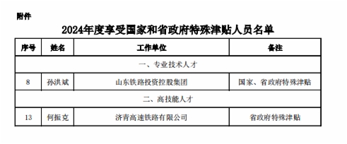 近日,山東省人力資源和社會保障廳公布2024年度享受國家和省政府特殊津貼人員名單,山東鐵投集團總經(jīng)理助理孫洪斌入選享受國家特殊津貼、省政府特殊津貼名單,山東鐵投智能科技工程有限公司(申報時就職濟青高速鐵路有限公司)何振克入選享受省政府特殊津貼名單。